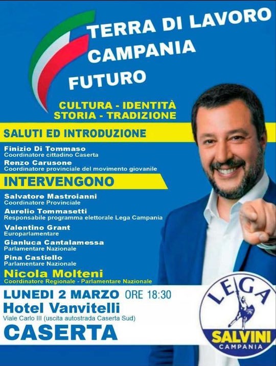 Lunedì 2 marzo alle ore 18:30 presso l'Hotel Vanvitelli di Caserta ci sarà l'appuntamento politico in Terra di Lavoro della Lega. Interverranno tutti i coordinatori cittadini, provinciali e regionali, da Finizio Di Tommaso a Renzo Carusone, da Salvatore Mastroianni a Gianluca Cantalamessa, oltre agli Onn. Pina Castiello e Nicola Molteni, all'Eurodeputato Valentino Grant, e ad Aurelio Tommasetti tra i papabili candidati alla presidenza della Regione Campania alle imminenti elezioni.