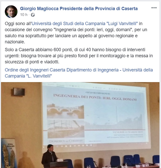 Il Presidente della Provincia di Caserta Giorgio Magliocca è intervenuto al convegno "Ingegneria dei ponti: ieri, oggi, domani", ed ha espresso questo pensiero.