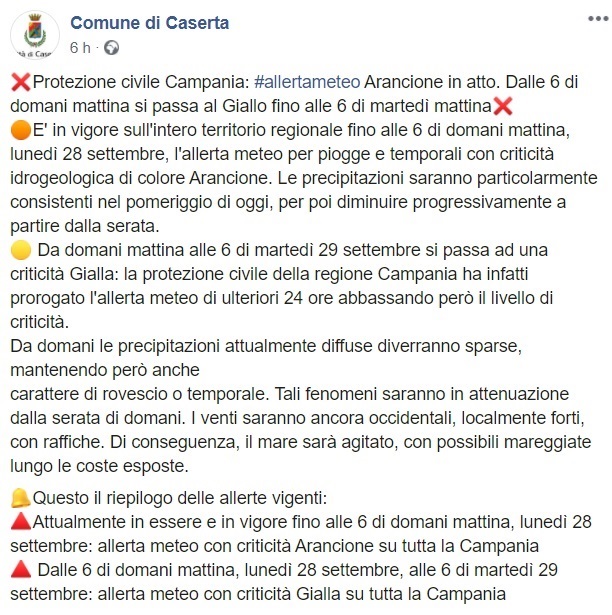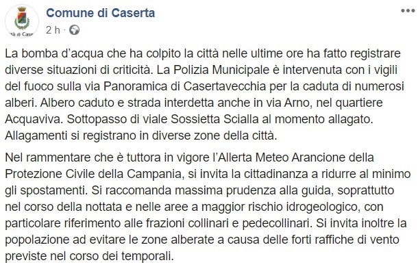 Questo quanto comunicato dal Comune di Caserta