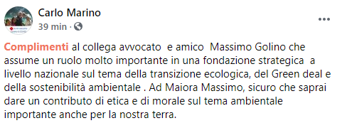 In mattinata sono arrivati anche i complimenti del Sindaco di Caserta Carlo Marino che in un post pubblicato sulla sua pagina Facebook ha dichiarato: "Complimenti al collega avvocato e amico Massimo Golino che assume un ruolo molto importante in una fondazione strategica a livello nazionale - si legge nel post - sul tema della transizione ecologica, del Green deal e della sostenibilità ambientale. Ad Maiora Massimo - prosegue il post - sicuro che saprai dare un contributo di etica e di morale sul tema ambientale importante anche per la nostra terra".