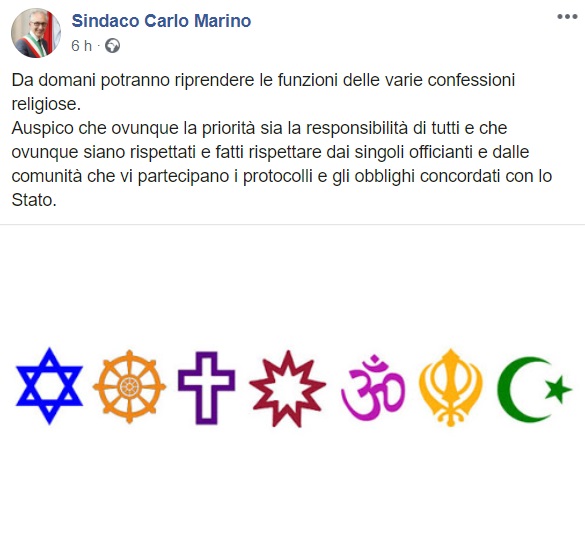 Ce. Marino: "Da domani potranno riprendere le funzioni delle varie confessioni religiose"