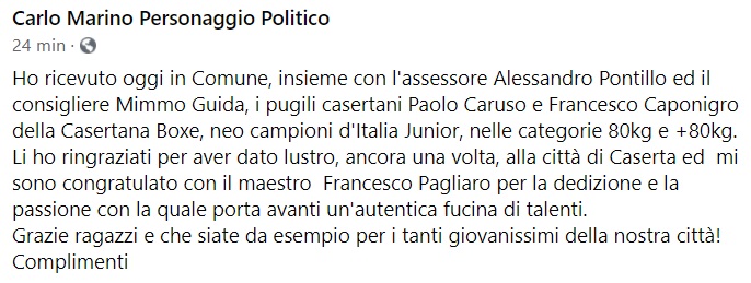 Ce. Marino. "Ho ricevuto in Comune i pugili casertani Caruso e Caponigro neo campioni d'Italia Junior"