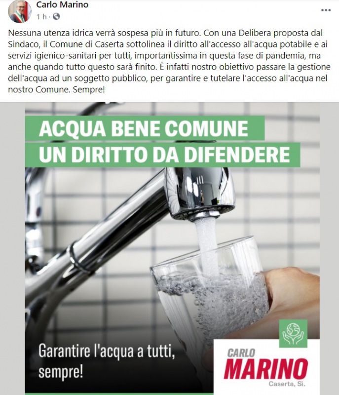 "Nessuna utenza idrica verrà sospesa più in futuro. Con una Delibera proposta dal Sindaco, il Comune di Caserta sottolinea il diritto all'accesso all'acqua potabile e ai servizi igienico-sanitari per tutti, importantissima- si legge nella nota- in questa fase di pandemia, ma anche quando tutto questo sarà finito. È infatti nostro obiettivo passare la gestione dell'acqua ad un soggetto pubblico, per garantire e tutelare l'accesso all'acqua nel nostro Comune. Sempre!"