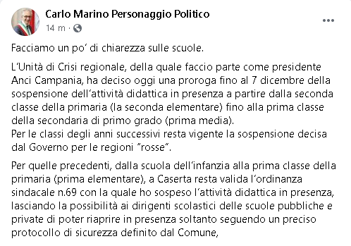 Lo apprendiamo dalla pagina Facebook di Carlo Marino, Sindaco di Caserta.