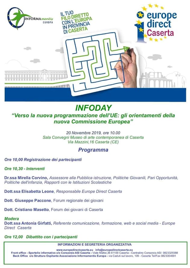Mercoledi 20 novembre alle ore 10.00 si terrà presso la sala covegni del Museo di Arte Contemporanea di Caserta l'incontro "Verso la nuova programmazione dell'EU: gli orientamenti della nuova Commissione Europea". Molti gli argomenti di discussione e gli invitati.