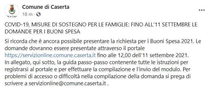 "Si ricorda che è ancora possibile presentare la richiesta per i Buoni Spesa 2021. Le domande dovranno essere presentate attraverso il portale https://servizionline.comune.caserta.it fino alle 12,00 dell’11 settembre 2021. -Si legge nella nota- In allegato, qui sotto, la guida passo-passo contenente tutte le istruzioni per registrarsi al portale e per effettuare la compilazione e l’invio del modulo. Per problemi di accesso o difficoltà nella compilazione della domanda si prega di scrivere a [email protected] ."
