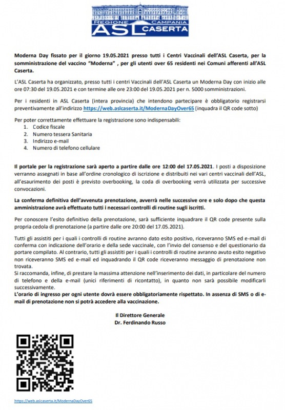 L’ASL Caserta ha organizzato, presso tutti i centri Vaccinali dell’ASL Caserta un Moderna Day con inizio alle ore 07:30 del 19.05.2021 e con termine alle ore 23:00 del 19.05.2021 per n. 5000 somministrazioni. Per i residenti in ASL Caserta (intera provincia) - si legge nella nota - che intendono partecipare è obbligatorio registrarsi preventivamente all’indirizzo https://web.aslcaserta.it/ModernaDayOver65 (inquadra il QR code sotto) Per poter correttamente effettuare la registrazione sono indispensabili: 1. Codice fiscale 2. Numero tessera Sanitaria 3. Indirizzo e-mail 4. Numero di telefono cellulare Il portale per la registrazione sarà aperto a partire dalle ore 12:00 del 17.05.2021. I posti a disposizione verranno assegnati in base all’ordine cronologico di iscrizione e distribuiti nei vari centri vaccinali dell’ASL, all’esaurimento dei posti è previsto overbooking, la coda di overbooking verrà utilizzata per successive convocazioni. La conferma definitiva dell’avvenuta prenotazione - si legge nella nota -, avverrà nelle successive ore e solo dopo che questa amministrazione avrà effettuato tutti i necessari controlli di routine sugli iscritti. Per conoscere l’esito definitivo della prenotazione, sarà sufficiente inquadrare il QR code presente sulla propria cedola di prenotazione (a partire dalle ore 20:00 del 17.05.2021). Tutti gli assistiti per i quali i controlli di routine avranno dato esito positivo, riceveranno SMS ed e-mail di conferma con indicazione dell’orario e della sede vaccinale, con l’invio del consenso e del questionario da portare compilato. Al contrario, tutti gli assistiti per i quali i controlli di routine avranno avuto esito negativo non riceveranno SMS ed e-mail ed inquadrando il QR code riceveranno messaggio di prenotazione non trovata. Si raccomanda, infine, di prestare la massima attenzione nell’inserimento dei dati, in particolare del numero di telefono e della e-mail (unici riferimenti di ricontatto), in quanto non sarà possibile modificarli successivamente. L’orario di ingresso per ogni utente - si legge nella nota - dovrà essere obbligatoriamente rispettato. In assenza di SMS o di email di prenotazione non si potrà accedere alla vaccinazione. Il Direttore Generale Dr. Ferdinando Russo".