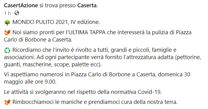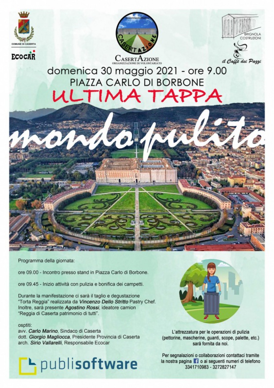 Questo quanto apprendiamo dalla pagina fb di CasertAzione: "MONDO PULITO 2021, IV edizione. Noi siamo pronti per l’ULTIMA TAPPA che interesserà la pulizia di Piazza Carlo di Borbone a Caserta. Ricordiamo che l’invito è rivolto a tutti, grandi e piccoli - si legge nella nota -, famiglie e associazioni. Ad ogni partecipante verrà fornito l’attrezzatura adatta (pettorine, guanti, mascherine, scope, palette ecc). Vi aspettiamo numerosi in Piazza Carlo di Borbone a Caserta, domenica 30 maggio alle ore 9.00. Le attività si svolgeranno nel rispetto della normativa Covid-19. Rimbocchiamoci le maniche e prendiamoci cura della nostra terra."