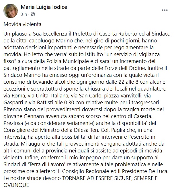 Questo quanto apprendiamo dalla pagina fb della Consigliera regionale Iodice: "Movida violenta Un plauso a Sua Eccellenza il Prefetto di Caserta Ruberto ed al Sindaco della citta' capoluogo Marino che, nel giro di pochi giorni, hanno adottato decisioni importanti e necessarie per regolamentare la movida. Ho letto che verra' subito istituito "un servizio di vigilanza fisso" - si legge nella nota - a cura della Polizia Municipale e ci sara' un incremento del pattugliamento nelle strade da parte delle Forze dell'Ordine. Inoltre il Sindaco Marino ha emesso oggi un'ordinanza (clicca qui) con la quale vieta il consumo di bevande alcoliche ogni giorno dalle 22 alle 8 con alcune eccezioni e soprattutto dispone la chiusura dei locali nel quadrilatero via Roma, via Unita' Italiana, via San Carlo, piazza Vanvitelli, via Gasparri e via Battisti - si legge nella nota - alle 0.30 con relative multe per i trasgressori. Ritengo siano dei provvedimenti doverosi dopo la tragica morte del giovane Gennaro avvenuta sabato scorso nel centro di Caserta. Preziosa (e da considerare seriamente) anche la disponibilita' del Consigliere del Ministro della Difesa Ten. Col. Paglia che, in una intervista, ha aperto alla possibilita' di far intervenire l'esercito in strada. Mi auguro che tali provvedimenti vengano adottati anche da altri comuni della provincia nei quali si assiste ad episodi di movida violenta. Infine, confermo il mio impegno per dare un supporto ai Sindaci di 'Terra di Lavoro' - si legge nella nota - relativamente a tale problematica e nelle prossime ore allertero' il Consiglio Regionale ed il Presidente De Luca. Le nostre strade devono TORNARE AD ESSERE SICURE, SEMPRE E OVUNQUE".
