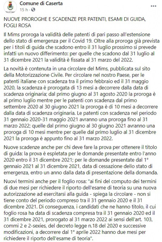 Questo quanto apprendiamo dalla pagina facebook del Comune di Caserta: