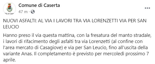 Questo quanto apprendiamo dalla pagina facebook del Comune di Caserta: