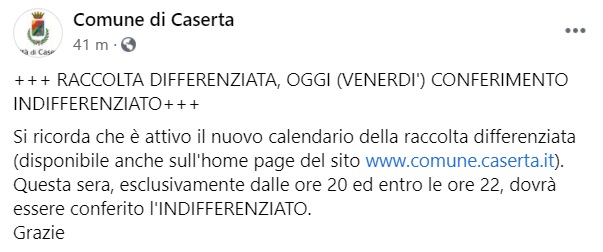 Questo quanto pubblicato sulla pagina fb del Comune di Caserta: "RACCOLTA DIFFERENZIATA, OGGI (VENERDI') CONFERIMENTO INDIFFERENZIATO+++ Si ricorda che è attivo il nuovo calendario della raccolta differenziata (disponibile anche sull'home page del sito www.comune.caserta.it). Questa sera, esclusivamente dalle ore 20 ed entro le ore 22, dovrà essere conferito l'INDIFFERENZIATO. Grazie"
