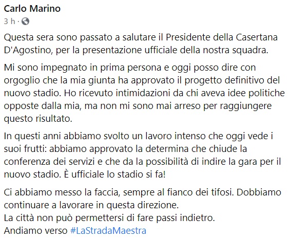 Questo quanto apprendiamo dalla pagina fb del Sindaco Marino: "Questa sera sono passato a salutare il Presidente della Casertana D'Agostino, per la presentazione ufficiale della nostra squadra. Mi sono impegnato in prima persona e oggi posso dire con orgoglio che la mia giunta ha approvato il progetto definitivo del nuovo stadio. Ho ricevuto intimidazioni da chi aveva idee politiche opposte dalla mia - si legge nella nota -, ma non mi sono mai arreso per raggiungere questo risultato. In questi anni abbiamo svolto un lavoro intenso che oggi vede i suoi frutti: abbiamo approvato la determina che chiude la conferenza dei servizi e che da la possibilità di indire la gara per il nuovo stadio. È ufficiale lo stadio si fa! Ci abbiamo messo la faccia, sempre al fianco dei tifosi. Dobbiamo continuare a lavorare in questa direzione. La città non può permettersi di fare passi indietro. Andiamo verso #LaStradaMaestra".