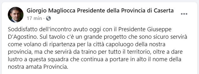 Questo quanto pubblicato sulla pagina facebook del Pres. della Prov. Ce Giorgio Magliocca: "Soddisfatto dell'incontro avuto oggi con il Presidente Giuseppe D'Agostino. Sul tavolo c'è un grande progetto che sono sicuro - si legge nella nota - servirà come volano di ripartenza per la città capoluogo della nostra provincia, ma che servirà da traino per tutto il territorio, oltre a dare lustro a questa squadra che continua a portare in alto il nome della nostra amata Provincia."