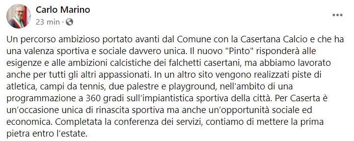 "Un percorso ambizioso portato avanti dal Comune con la Casertana Calcio e che ha una valenza sportiva e sociale davvero unica. Il nuovo "Pinto" risponderà alle esigenze e alle ambizioni calcistiche dei falchetti casertani, ma abbiamo lavorato anche- si legge nella nota- per tutti gli altri appassionati. In un altro sito vengono realizzati piste di atletica, campi da tennis, due palestre e playground, nell'ambito di una programmazione a 360 gradi sull’impiantistica sportiva della città. Per Caserta è un’occasione unica di rinascita sportiva ma anche un’opportunità sociale ed economica. Completata la conferenza dei servizi, contiamo- si legge nella nota- di mettere la prima pietra entro l’estate."