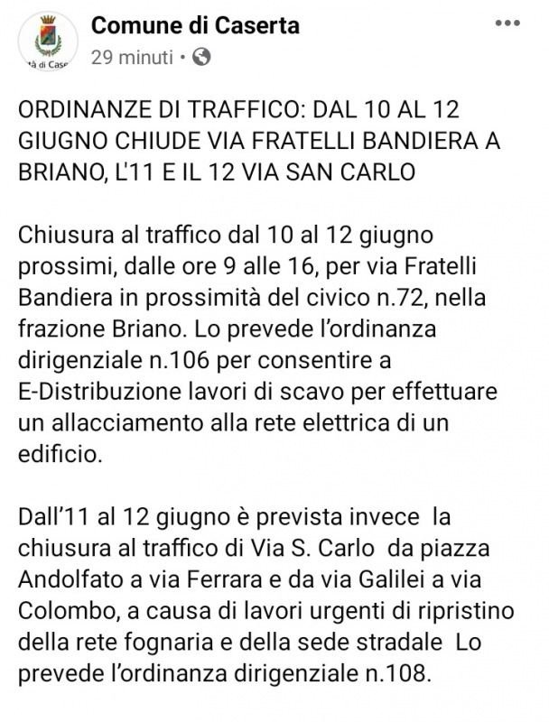 Questo quanto comunicato dal Comune di Caserta