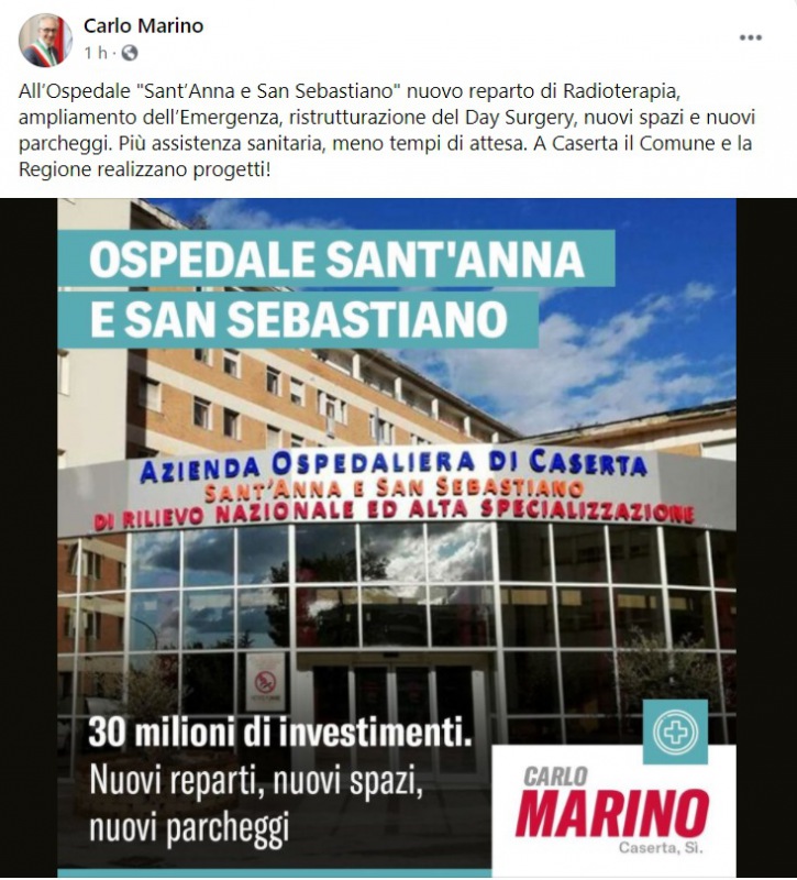 "All’Ospedale "Sant’Anna e San Sebastiano" nuovo reparto di Radioterapia, ampliamento dell’Emergenza, ristrutturazione del Day Surgery, nuovi spazi e nuovi parcheggi. -Si legge nlla nota- Più assistenza sanitaria, meno tempi di attesa. A Caserta il Comune e la Regione realizzano progetti!
