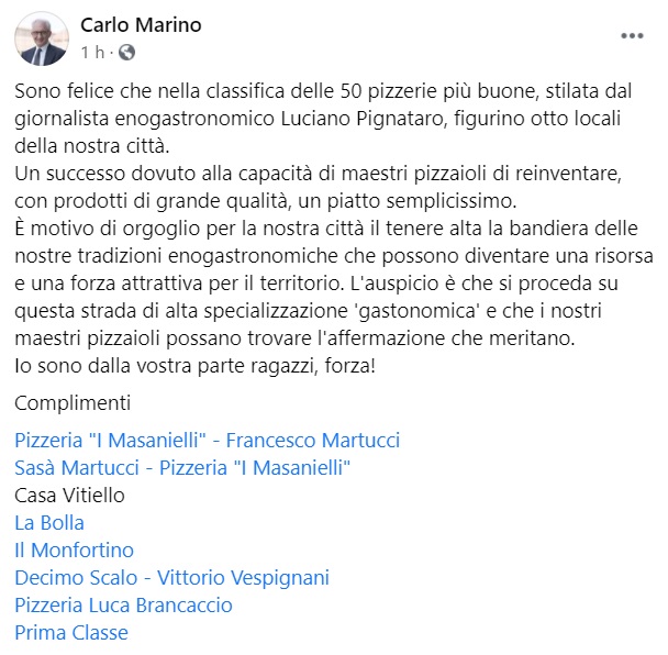 "Sono felice che nella classifica delle 50 pizzerie più buone, stilata dal giornalista enogastronomico Luciano Pignataro, figurino otto locali della nostra città. Un successo dovuto alla capacità di maestri pizzaioli di reinventare, con prodotti di grande qualità, un piatto- si legge nella nota- semplicissimo. È motivo di orgoglio per la nostra città il tenere alta la bandiera delle nostre tradizioni enogastronomiche che possono diventare una risorsa e una forza attrattiva per il territorio. L'auspicio è che si proceda su questa strada di alta specializzazione 'gastonomica' e che i nostri maestri pizzaioli possano trovare l'affermazione che meritano. Io sono- si legge nella nota- dalla vostra parte ragazzi, forza! Complimenti Pizzeria "I Masanielli" - Francesco Martucci Sasà Martucci - Pizzeria "I Masanielli", Casa Vitiello, La Bolla, Il Monfortino, Decimo Scalo - Vittorio Vespignani, Pizzeria Luca Brancaccio, Prima Classe"