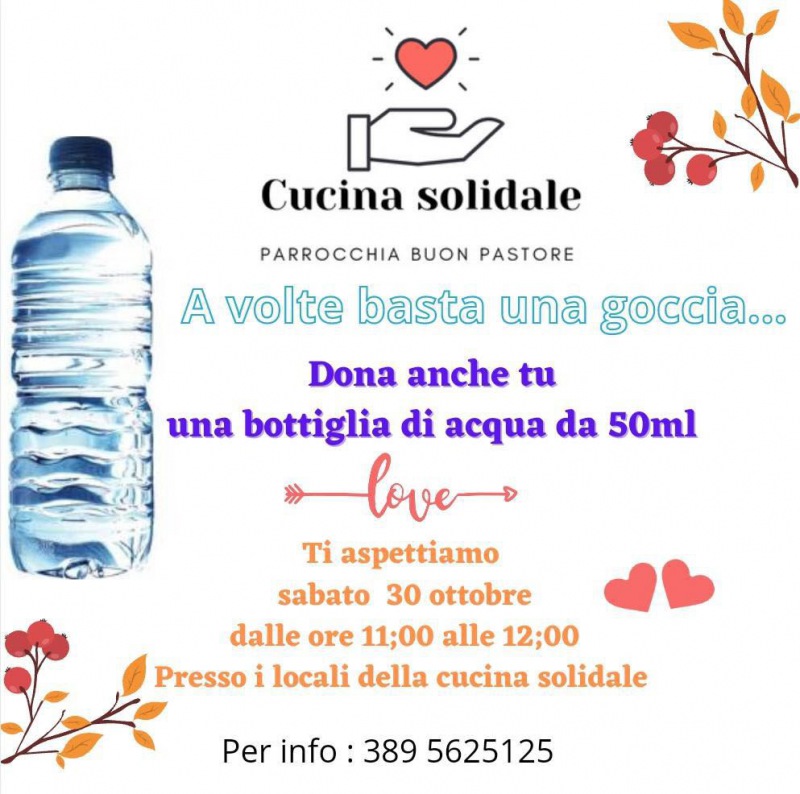 Presso i locali della cucina solidale della Parrocchia Buon Pastore di Caserta, sabato 30 ottobre dalle ore 11 alle 12, ci sarà una raccolta di bottiglie d'acqua da 50ml. Lo slogan di questa raccolta è "A volte basta una goccia...", con chiaro riferimento all'importanza dell'acqua. Ci si aspetta un cospicuo numero di donazioni.