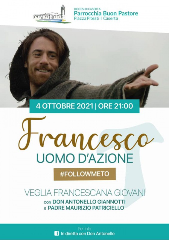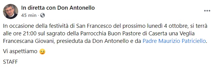 Questo quanto apprendiamo dalla pagina fb In diretta con Don Antonello: "In occasione della festività di San Francesco del prossimo lunedì 4 ottobre, si terrà alle ore 21:00 sul sagrato della Parrocchia Buon Pastore di Caserta una Veglia Francescana Giovani, presieduta da Don Antonello e da Padre Maurizio Patriciello. Vi aspettiamo STAFF"