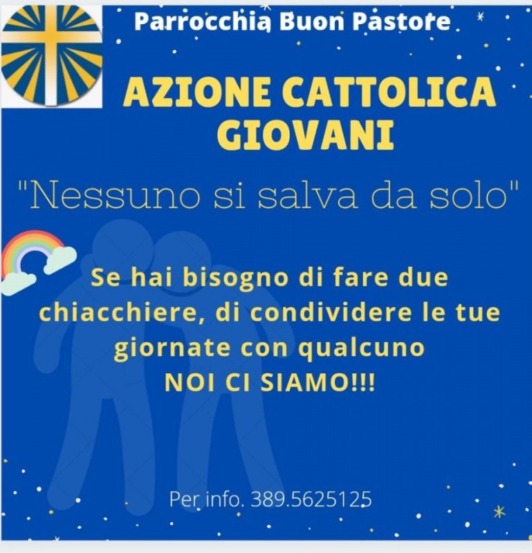 La Parrocchia Buon Pastore di Caserta, nello specifico l'Azione Cattolica, mette a disposizione di tutti, fedeli e non, un apposito numero telefonico. Chiunque vorrà, potrà chiamare per ricevere supporto, qualche parola di conforto, visto il periodo difficile che stiamo affrontando, o potrà seplicemente scambiare quattro chiacchiere col suo interlocutore, allo scopo di sentirsi un po' meno solo e di convidere le proprie giornate con qualcun altro.