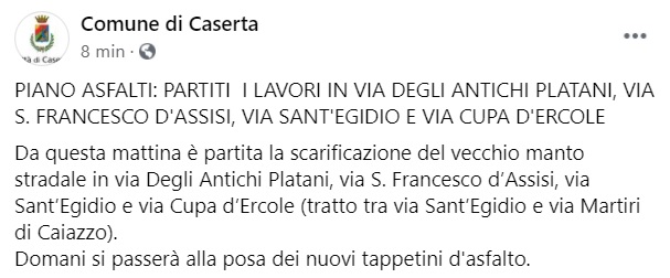 Questo quanto apprendiamo dalla pagina fb del Comune di Caserta: "PIANO ASFALTI: PARTITI I LAVORI IN VIA DEGLI ANTICHI PLATANI, VIA S. FRANCESCO D'ASSISI, VIA SANT'EGIDIO E VIA CUPA D'ERCOLE Da questa mattina è partita la scarificazione del vecchio manto stradale in via Degli Antichi Platani, via S. Francesco d’Assisi, via Sant’Egidio e via Cupa d’Ercole (tratto tra via Sant’Egidio e via Martiri di Caiazzo). Domani si passerà alla posa dei nuovi tappetini d'asfalto."