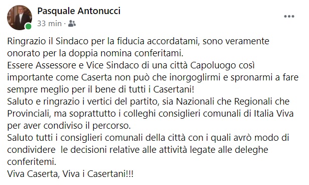 "Ringrazio il Sindaco per la fiducia accordatami, sono veramente onorato per la doppia nomina conferitami. Essere Assessore e Vice Sindaco di una città Capoluogo così importante come Caserta non può che inorgoglirmi e spronarmi a fare sempre meglio per il bene di tutti i Casertani! Saluto e ringrazio i vertici del partito, sia Nazionali che Regionali che Provinciali, ma soprattutto i colleghi consiglieri comunali di Italia Viva per aver condiviso il percorso. -Si legge nella nota- Saluto tutti i consiglieri comunali della città con i quali avrò modo di condividere le decisioni relative alle attività legate alle deleghe conferitemi. Viva Caserta, Viva i Casertani!!!"
