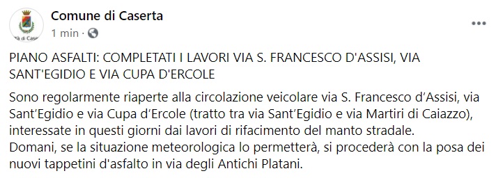 "PIANO ASFALTI: COMPLETATI I LAVORI VIA S. FRANCESCO D'ASSISI, VIA SANT'EGIDIO E VIA CUPA D'ERCOLE. Sono regolarmente riaperte alla circolazione veicolare via S. Francesco d’Assisi, via Sant’Egidio e via Cupa d’Ercole (tratto tra via Sant’Egidio e via Martiri di Caiazzo), interessate- si legge nella nota- in questi giorni dai lavori di rifacimento del manto stradale. Domani, se la situazione meteorologica lo permetterà, si procederà con la posa dei nuovi tappetini d'asfalto in via degli Antichi Platani."