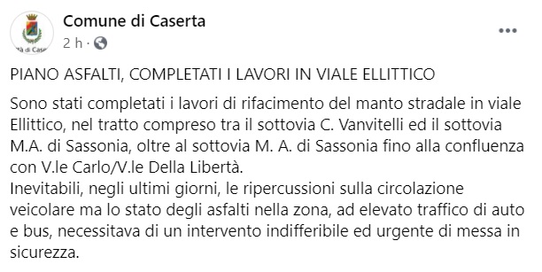 "PIANO ASFALTI, COMPLETATI I LAVORI IN VIALE ELLITTICO. Sono stati completati i lavori di rifacimento del manto stradale in viale Ellittico, nel tratto compreso tra il sottovia C. Vanvitelli ed il sottovia M.A. di Sassonia, oltre al sottovia M. A. di Sassonia fino alla confluenza- si legge nella nota- con V.le Carlo/V.le Della Libertà. Inevitabili, negli ultimi giorni, le ripercussioni sulla circolazione veicolare ma lo stato degli asfalti nella zona, ad elevato traffico di auto e bus, necessitava di un intervento indifferibile ed urgente di messa in sicurezza."