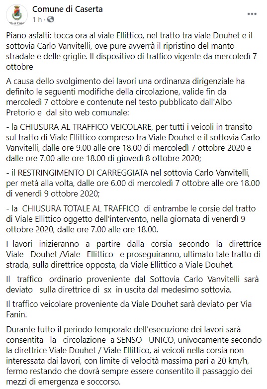 Questo quanto comunicato dal Comune di Caserta