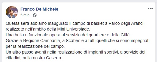 Il vice sindaco di Caserta Franco De Michele è soddisfatto per l'inaugurazione del playground al Parco degli Aranci