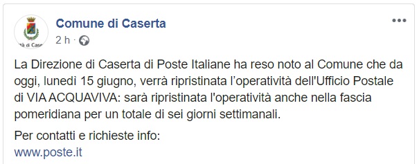 Questo quanto comunicato dal Comune di Caserta