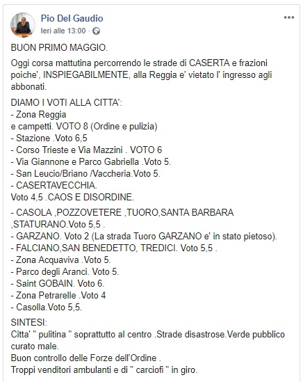 L'ex Sindaco di Caserta Pio Del Gaudio si è cimentato nel valutare la città nel giorno del 1° maggio.