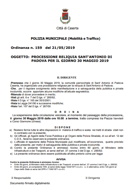 Lo apprendiamo dall'albo pretorio del Comune di Caserta.