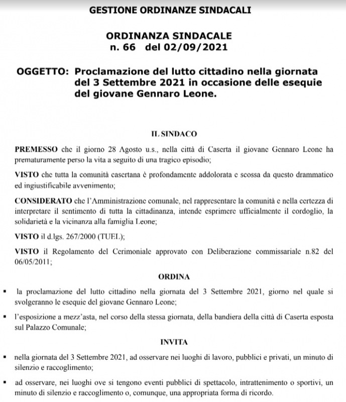 IL SINDACO PREMESSO che il giorno 28 Agosto u.s., nella città di Caserta il giovane Gennaro Leone ha prematuramente perso la vita a seguito di una tragico episodio; VISTO che tutta la comunità casertana è profondamente addolorata e scossa da questo drammatico ed ingiustificabile avvenimento - si legge nella nota -; CONSIDERATO che l’Amministrazione comunale, nel rappresentare la comunità e nella certezza di interpretare il sentimento di tutta la cittadinanza, intende esprimere ufficialmente il cordoglio, la solidarietà e la vicinanza alla famiglia Leone; VISTO il d.lgs. 267/2000 (TUEL); VISTO il Regolamento del Cerimoniale approvato con Deliberazione commissariale n.82 del 06/05/2011; ORDINA la proclamazione del lutto cittadino nella giornata del 3 Settembre 2021, giorno nel quale si svolgeranno le esequie del giovane Gennaro Leone; l’esposizione a mezz’asta, nel corso della stessa giornata, della bandiera della città di Caserta esposta sul Palazzo Comunale; INVITA nella giornata del 3 Settembre 2021 - si legge nella nota -, ad osservare nei luoghi di lavoro, pubblici e privati, un minuto di silenzio e raccoglimento; ad osservare, nei luoghi ove si tengono eventi pubblici di spettacolo, intrattenimento o sportivi, un minuto di silenzio e raccoglimento o, comunque, una appropriata forma di ricordo."