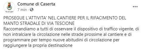 Questo quanto apprendiamo dalla pagina facebook del Comune di Caserta: