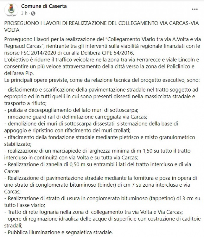 Questo quanto apprendiamo dalla pagina fb del Comuned i Caserta: "PROSEGUONO I LAVORI DI REALIZZAZIONE DEL COLLEGAMENTO VIA CARCAS-VIA VOLTA