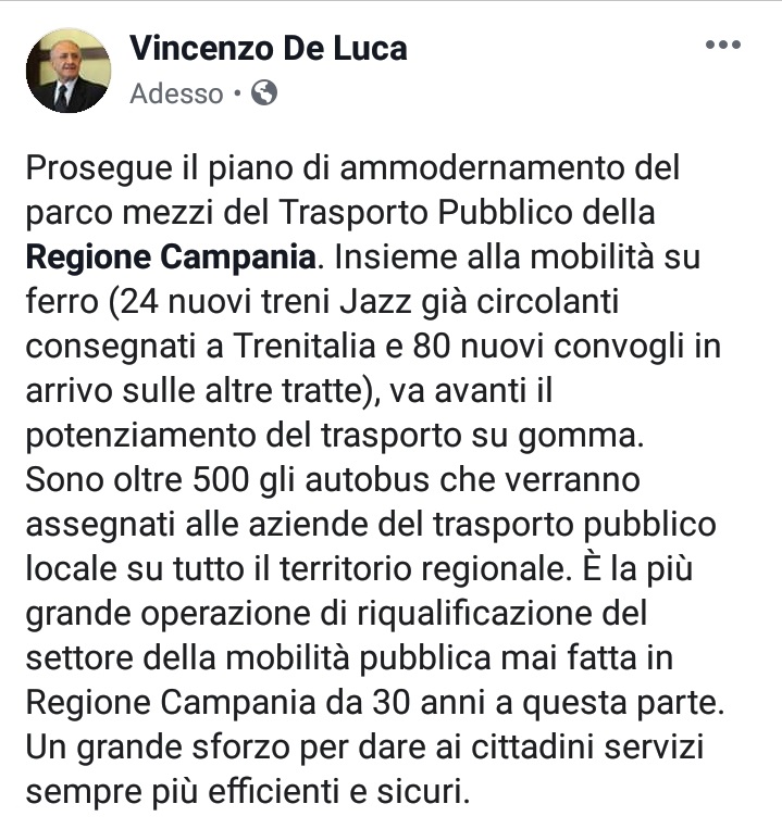 Questo quanto pubblica sulla pagina facebook del Presidente De Luca