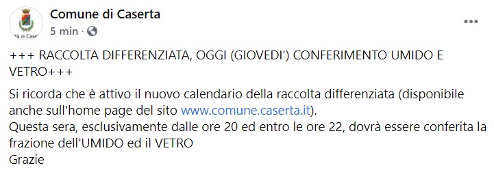 "+++ RACCOLTA DIFFERENZIATA, OGGI (GIOVEDI') CONFERIMENTO UMIDO E VETRO+++ Si ricorda che è attivo il nuovo calendario della raccolta differenziata (disponibile anche sull'home page del sito www.comune.caserta.it). Questa sera, esclusivamente dalle ore 20 ed entro le ore 22, dovrà essere conferita- si legge nella nota- la frazione dell'UMIDO ed il VETRO. Grazie"