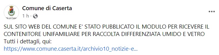 Questo quanto apprendiamo dalla pagina fb del Comune di Caserta: "SUL SITO WEB DEL COMUNE E' STATO PUBBLICATO IL MODULO PER RICEVERE IL CONTENITORE UNIFAMILIARE PER RACCOLTA DIFFERENZIATA UMIDO E VETRO Tutti i dettagli, qui: CLICCA QUI"