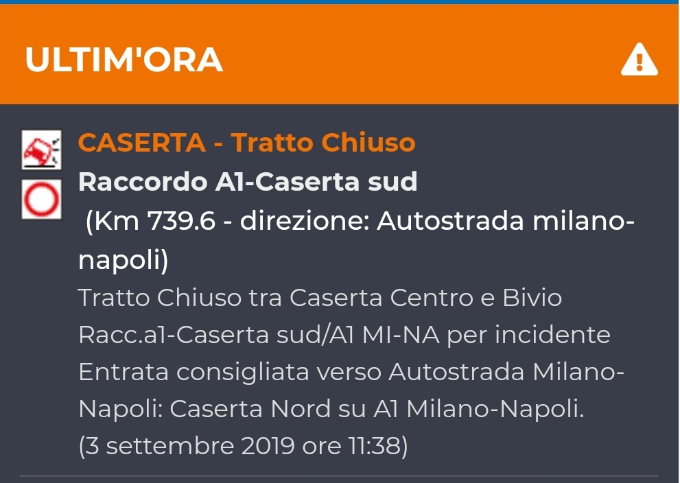Traffico Bloccato tra Caserta Centro e Bivio Racc.a1-Caserta sud/A1 MI-NA per incidente. (3 settembre 2019 ore 11:15).