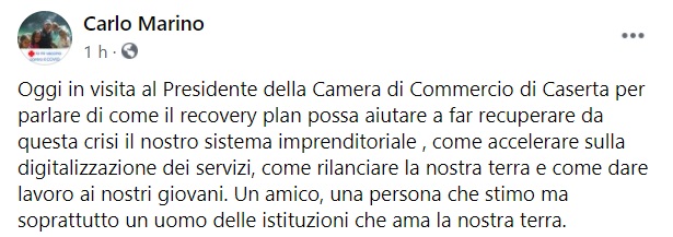 Questo quanto pubblicato sul profilo fb del Sindaco Marino: "Oggi in visita al Presidente della Camera di Commercio di Caserta per parlare di come il recovery plan possa aiutare a far recuperare da questa crisi il nostro sistema imprenditoriale, come - si legge nella nota - accelerare sulla digitalizzazione dei servizi, come rilanciare la nostra terra e come dare lavoro ai nostri giovani. Un amico, una persona che stimo ma soprattutto un uomo delle istituzioni che ama la nostra terra."