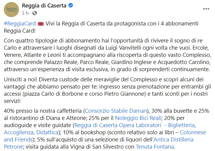 Questo quanto apprendiamo dalla pagina fb della Reggia di Caserta: "Reggia Card Vivi la Reggia di Caserta da protagonista con i 4 abbonamenti Reggia Card! Con quattro tipologie di abbonamento hai l’opportunità di rivivere il sogno di re Carlo - si legge nella nota - e attraversare i luoghi disegnati da Luigi Vanvitelli ogni volta che vuoi. Ercole, Venere, Atlante e Leoni ti accompagnano alla riscoperta di questo vasto Complesso, che comprende Palazzo Reale, Parco Reale, Giardino Inglese e Acquedotto Carolino, attraverso un’esperienza di visita esclusiva, in grado di sorprenderti continuamente. Unisciti a noi! Diventa custode delle meraviglie del Complesso - si legge nella nota - e scopri alcuni dei vantaggi che abbiamo pensato per te: ingresso senza prenotazione per entrambi gli accessi (piazza Carlo di Borbone e corso Pietro Giannone) e tanti sconti per i nostri servizi! 40% presso la nostra caffetteria (Consorzio Stabile Daman), 30% alla buvette e 25% al ristorantino di Diana e Atteone; 25% per il Noleggio Bici Reali; 20% per audioguide e visite guidate (Reggia di Caserta Opera Laboratori - Biglietteria, Accoglienza, Didattica); 10% al bookshop (sconto relativo solo ai libri – Colonnese and Friends); 5% sull’acquisto di una selezione di liquori - si legge nella nota - dell’Antica Distilleria Petrone; visita guidata alla Vigna di San Silvestro con Tenuta Fontana. Tutte le info e i dettagli: CLICCA QUI".