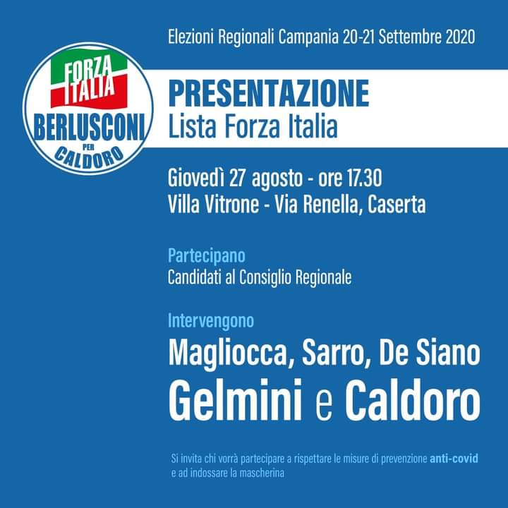 Giovedì 27 agosto presentazione della lista di Forza Italia. La presentazione avverrà alle ore 17:30 presso Villa Vitrone a Caserta. Oltre ai candidati interverranno Magliocca, Sarro, De Siano, Gelmini e Caldoro.