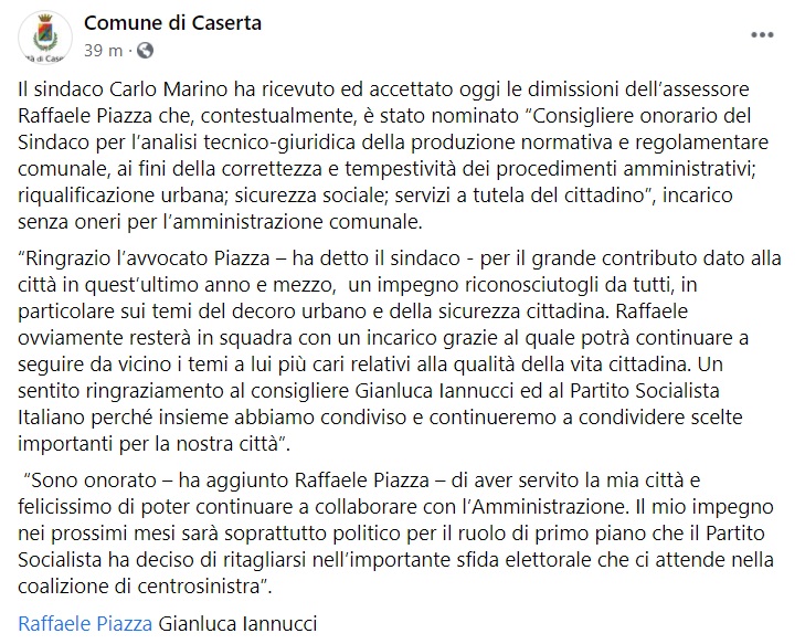 Questo quanto pubblicato sulla pagina facebook del Comune di Caserta: