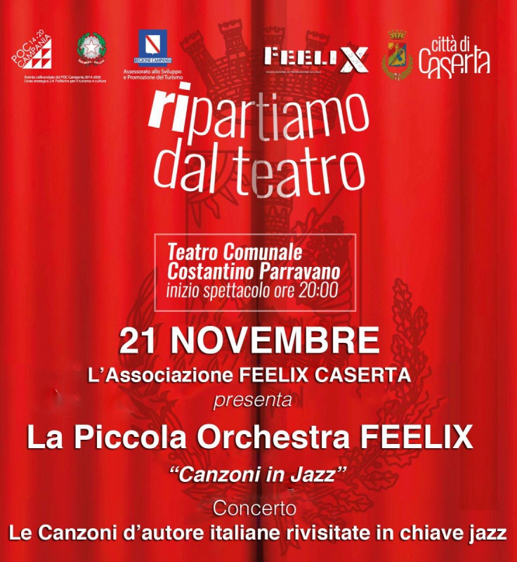 "«Canzoni in jazz». È il titolo dello spettacolo della Piccola Orchestra Feelix protagonista domenica 21 novembre alle 20 al Teatro Comunale «Costantino Parravano» di Caserta. L’evento fa parte della rassegna «Ripartiamo dal teatro», promossa dagli assessorati alla Cultura e ai Grandi Eventi del Comune di Caserta e finanziata dalla Regione Campania (POC Campania 2014-2020), in programma fino al 30 novembre. L’ingresso è libero fino a esaurimento posti con prenotazione 72 ore prima di ogni spettacolo su www.eventbrite.it. L’accesso agli eventi è consentito agli spettatori muniti di green pass e di mascherina. -Si legge nella nota- In scaletta i brani jazz più belli di sempre, come Sophisticated Lady, Sing sing sing, My Funny Valentine e quelli interpretati da Frank Sinatra. Sono semplicemente delle canzoni americane al pari di quelle del vastissimo repertorio della musica leggera italiana, ricco di capolavori perfetti per essere rielaborati con arrangiamento jazz. E così, brani che hanno fatto la storia della canzone d’autore (Guarda che luna, Munasterio, La canzone di Marinella, Scrivimi, Senza fine) sono stati arrangiati per un combo orchestrale, ognuno in modo diverso per raccontare le diverse epoche del jazz. -Si legge nella nota- Dal dixieland allo swing, al be bop. Gli arrangiamenti sono stati curati da Marcello Massa, che dirige Ilaria Bucci (voce), Aldo Capasso (contrabbasso), Giampiero Franco (batteria), Antonio Perna (piano), Egidio Marchitelli (chitarra), Gianni Taglialatela (sax baritono), Gianni D’Argenzio (sax tenore), Giuseppe Giroffi (primo sax alto), Giovanni Gambardella (secondo sax alto), Franco Izzo (trombone), Antonio Baldino (prima tromba), Flavio Dapiran (seconda tromba). La Piccola Orchestra Feelix è una nuova sfida per l’associazione Feelix e per tutti gli appassionati di jazz. L’associazione culturale Feelix nasce nel 2014 dall’iniziativa di amici appassionati per favorire la diffusione della musica jazz, e in generale della cultura musicale, a Caserta e al Sud. Lo stesso neologismo Feelix altro non è che l’incontro tra feeling e felix, un sentimento che evoca ritmi afro-americani e un’armonia che prelude al ritorno di una “Campania Felix”. -Si legge nella nota- L’associazione prende quota con la fondazione del club DayTwenty9, inaugurato il 29 aprile del 2015. Da quel momento ha collezionato più di 130 concerti, jam session tutte le settimane e ospiti artisti nazionali e internazionali. Dal 2017 l’associazione ha dato vita a una grande orchestra jazz, la Feelix Jazz Orchestra (già Campania Feelix Jazz Orchestra) che, giorno dopo giorno, ha messo insieme un vasto repertorio, incontrandosi nella sala del club DayTwenty9 adibita per l’occasione a sala prove, partendo dalle partiture scritte da Pietro Condorelli. Nel 2020, durante il periodo della forzata chiusura delle attività dell’associazione a causa del Covid, è stato ideato un nuovo progetto, quello di utilizzare il vastissimo repertorio della canzone d’autore italiane in chiave jazz: nasce “Le canzoni in Jazz”."