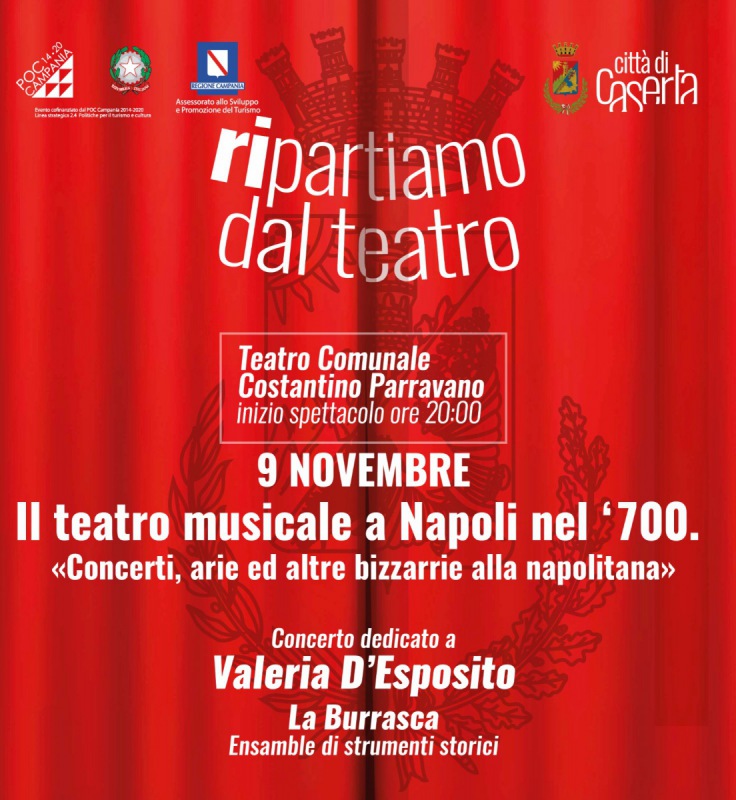 Nuovo appuntamento per la manifestazione "Ripartiamo dal Teatro" prevista per martedì 9 novembre alle ore 20:00, presso il teatro comunale Constantino Parravano di Caserta, dove sarà presentata l'opera "Il teatro musicale a Napoli nel '700". Concerto dedicato a Valeria D'Esposito.