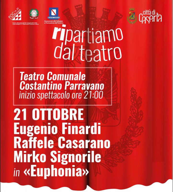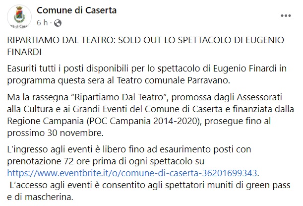 "Easuriti tutti i posti disponibili per lo spettacolo di Eugenio Finardi in programma questa sera al Teatro comunale Parravano. Ma la rassegna “Ripartiamo Dal Teatro”, promossa dagli Assessorati alla Cultura e ai Grandi Eventi del Comune di Caserta e finanziata dalla Regione Campania (POC Campania 2014-2020), prosegue fino al prossimo 30 novembre. -Si legge nella nota- L’ingresso agli eventi è libero fino ad esaurimento posti con prenotazione 72 ore prima di ogni spettacolo su https://www.eventbrite.it/o/comune-di-caserta-36201699343. L’accesso agli eventi è consentito agli spettatori muniti di green pass e di mascherina."