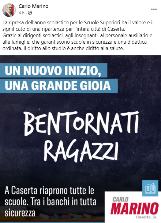 "La ripresa dell’anno scolastico per le Scuole Superiori ha il valore e il significato di una ripartenza per l’intera città di Caserta. Grazie ai dirigenti scolastici, agli insegnanti, al personale ausiliario e alle famiglie, che garantiscono-si legge nella nota- scuole in sicurezza e una didattica ordinata. Il diritto allo studio è anche diritto alla salute."