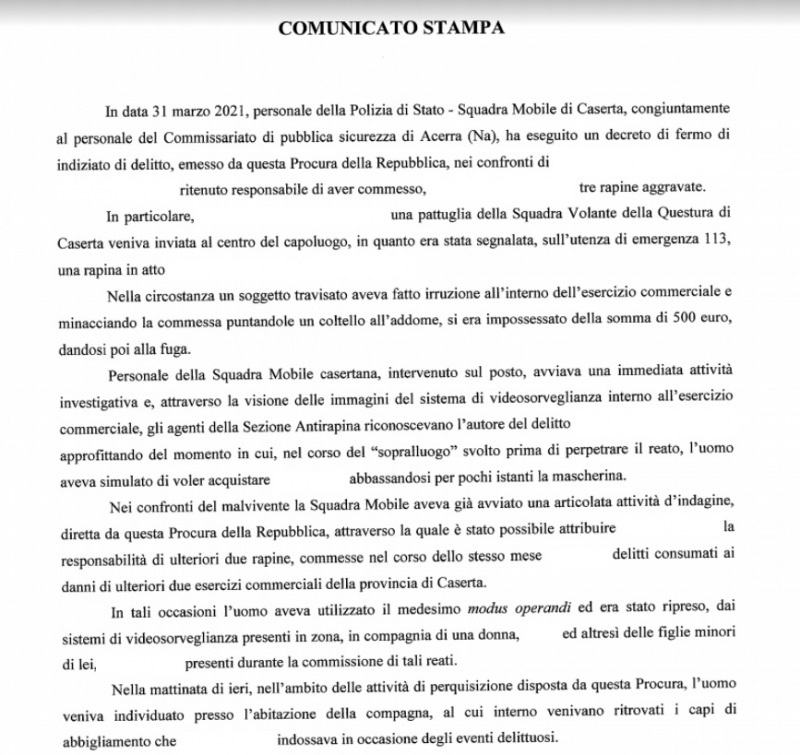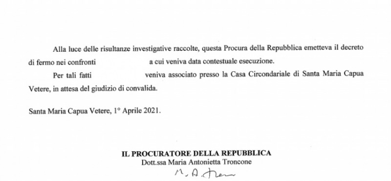 Questa parte della nota stampa della Procura della Repubblica presso il Tribunale di SMCV:
